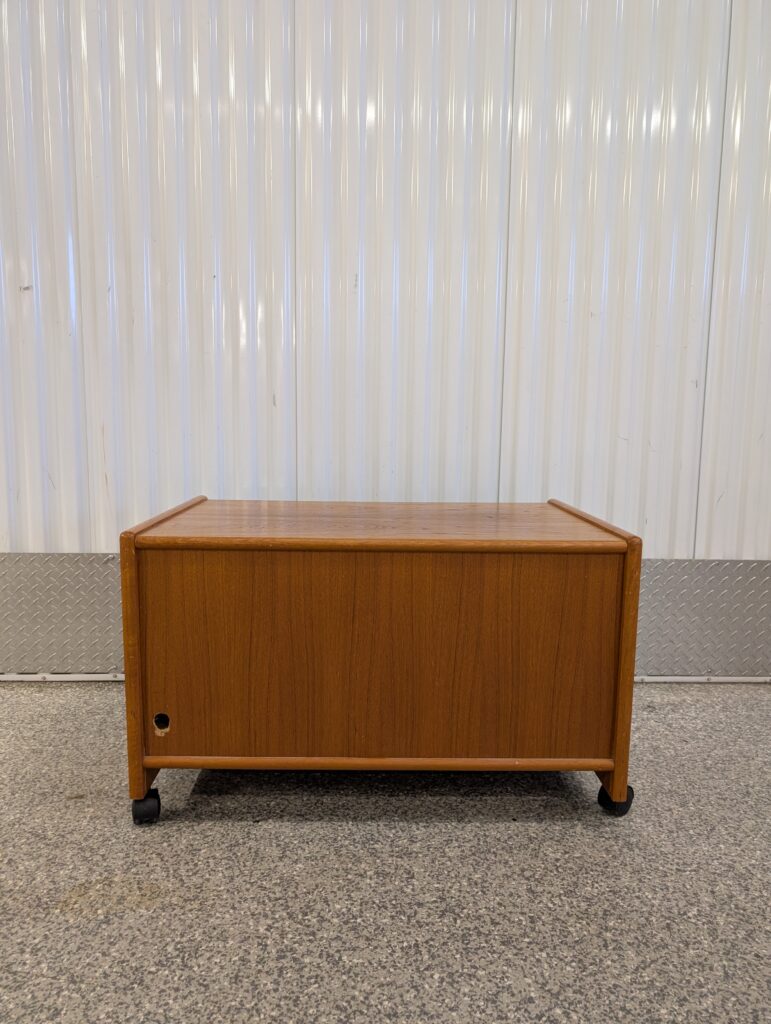 Clean and versatile teak media cabinet featuring a compact, low-profile design and warm wood tones. This piece sits on original rolling casters, making it easy to move and perfect for flexible living spaces.