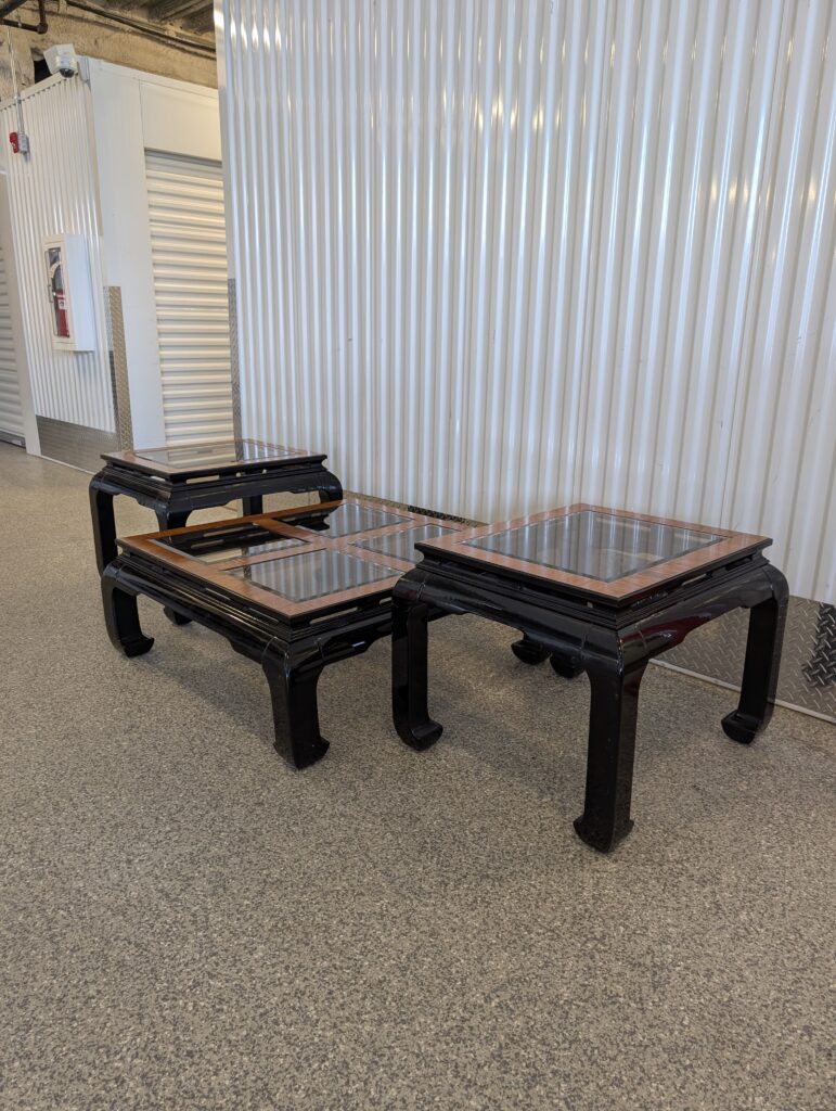 $200 – Vintage Asian-Inspired Coffee Table & Side Table Set with Black Lacquer Base