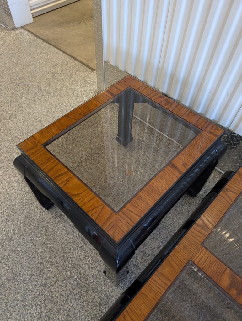 Striking vintage table set featuring a large coffee table and matching side table with Asian-inspired styling. The design combines glossy black lacquer bases with warm wood-framed tops and inset glass panels, creating a bold contrast that gives the pieces a sophisticated, decorative look.