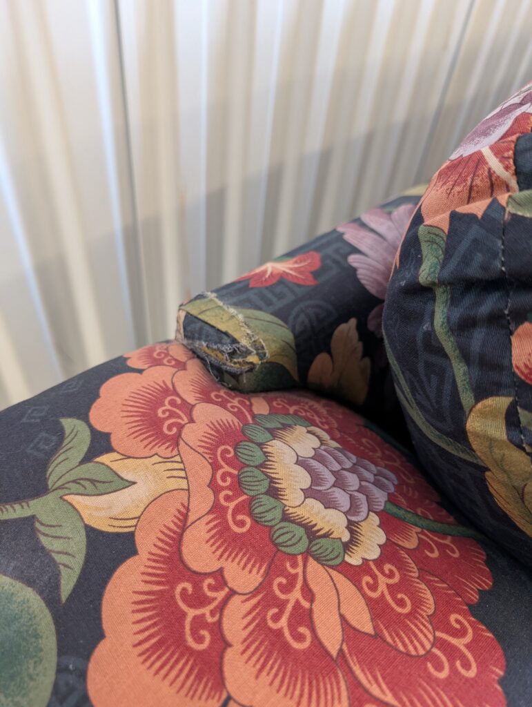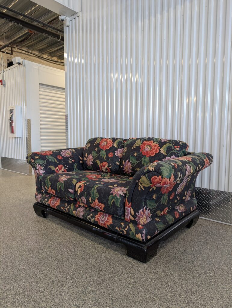 Stylish vintage loveseat featuring bold Asian-inspired floral upholstery and a sculptural black lacquer base. The dramatic pattern and curved silhouette give the piece a distinctive look that blends classic comfort with a touch of Hollywood Regency flair.
